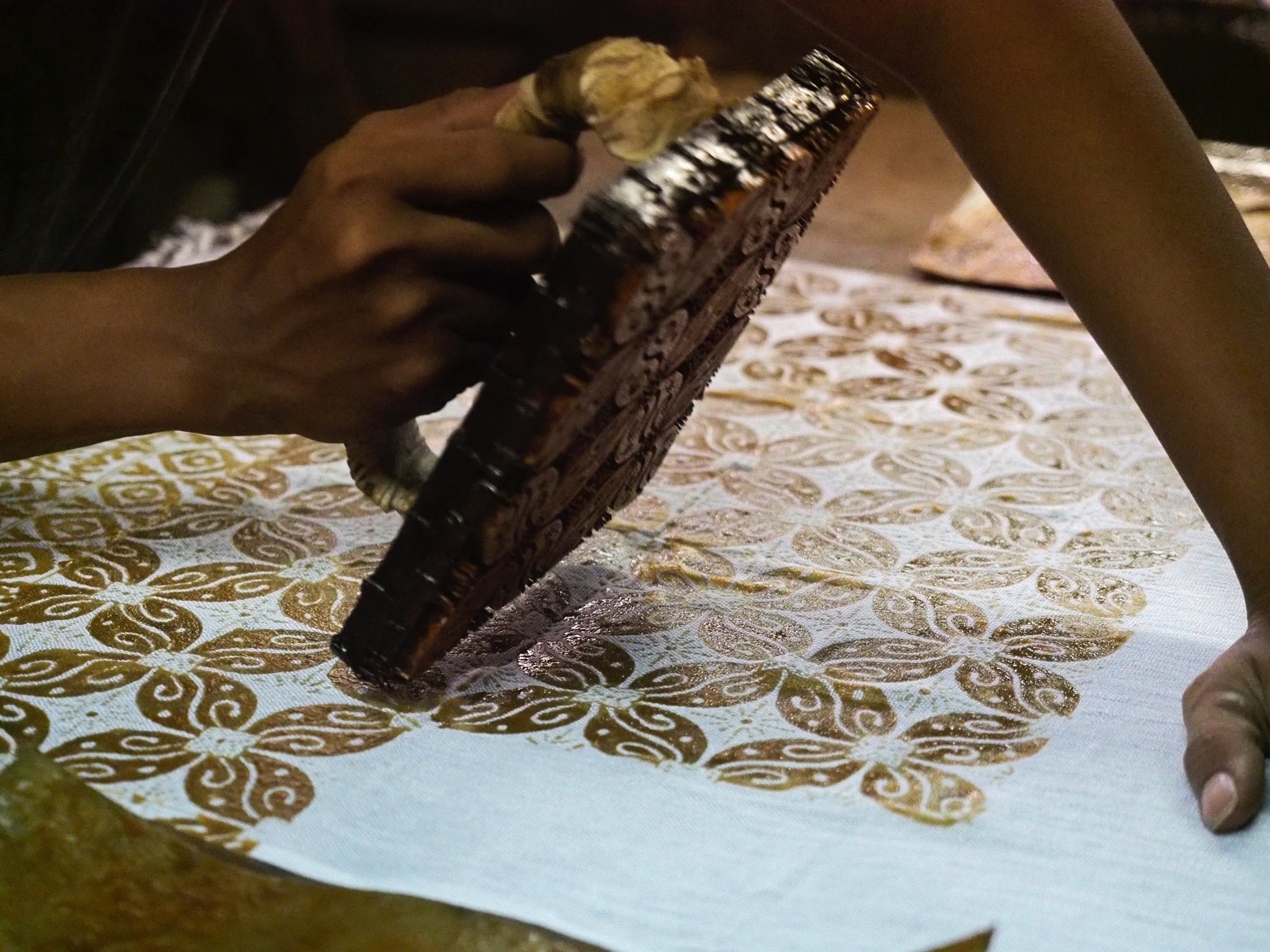 The calico method of textile printing (or “dab”) is no different from the art of woodblock printing which, in China, is perhaps older than the art of woodblock printing. wax impression, dating from the 3rd century BC. Both achieve the final result by pressing the element (the sheet of paper and the fabric respectively for the printing of the woodcuts and that of the calico) between two plates. The bottom plate has been etched to retain the dye/ink and produce the desired image on the surface of the object when pressed between the two plates. One can of course obtain very precise and very detailed results by the calico method, whereas a pre-designed plate worked to perfection leaves no chance for the movements of the hand, as with the wax printing method.